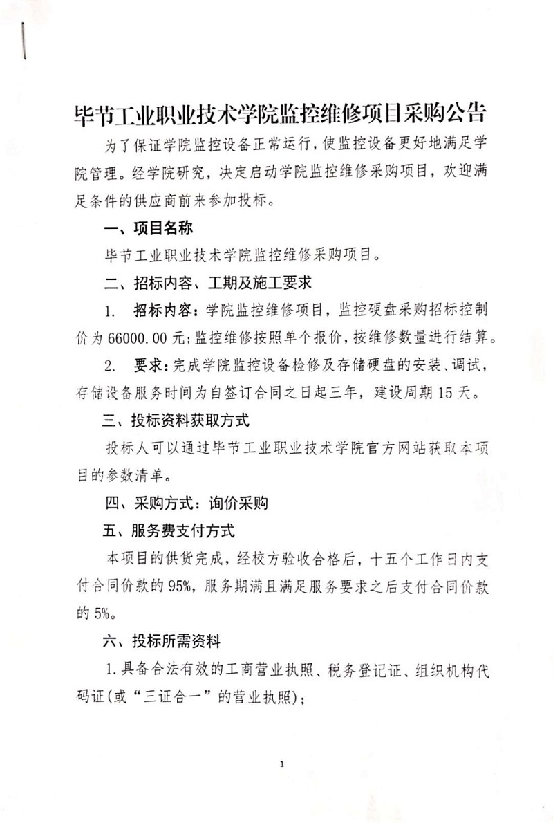 畢節(jié)工業(yè)職業(yè)技術學院監(jiān)控維修項目采購公告