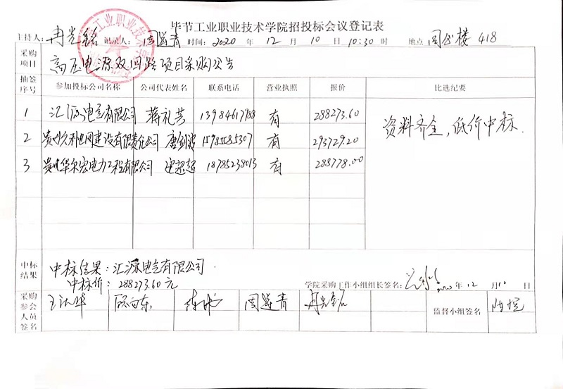 畢節(jié)工業(yè)職業(yè)技術學院高壓電源雙回路采購項目中標公告