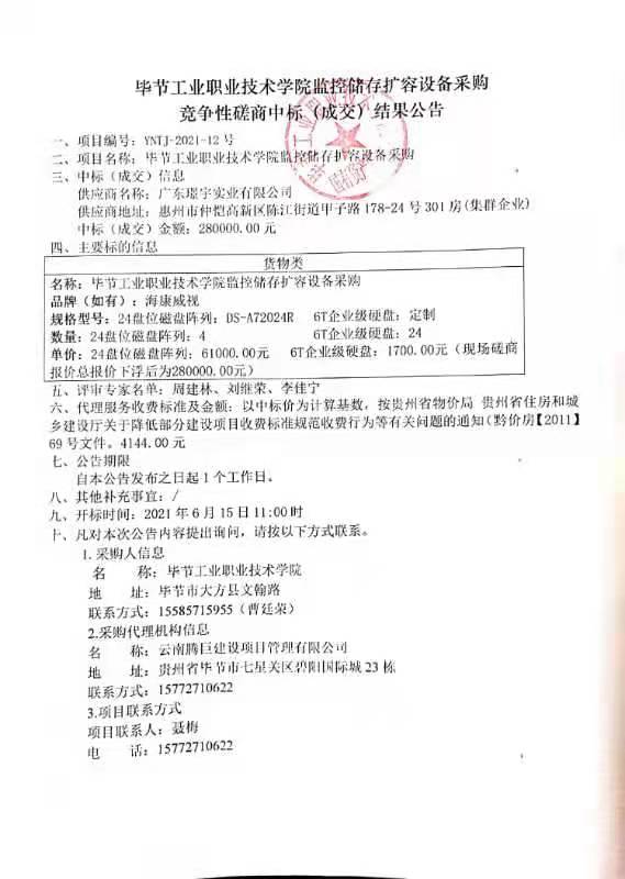 畢節(jié)工業(yè)職業(yè)技術學院監(jiān)控儲存擴容設備采購競爭性磋商中標(成交)結(jié)果公告