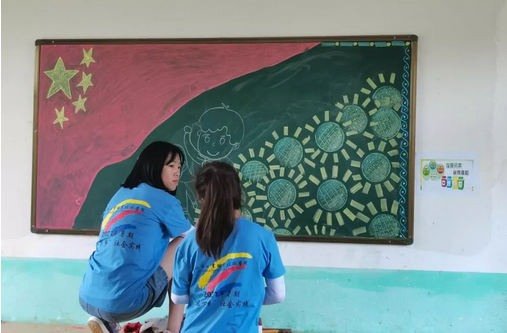 ▲志愿者將黨史知識繪到墻上和教室里
