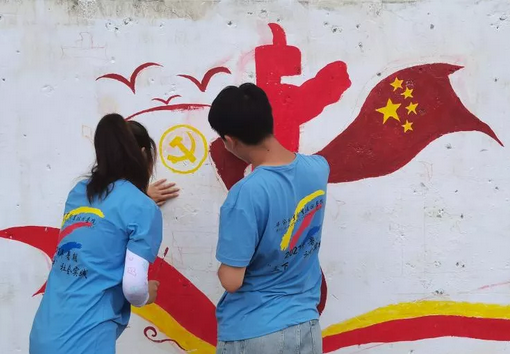 在為期10天的“三下鄉(xiāng)”社會實踐中,實踐隊員們把黨史學(xué)習(xí)教育帶到了田間地頭家中墻上。實踐隊員們走進(jìn)田間地頭,和當(dāng)?shù)剜l(xiāng)親們一起學(xué)習(xí)交流黨的發(fā)展歷程,到家中聆聽當(dāng)?shù)亍罢稀焙屯宋槔媳⒗宵h員講述他們的親身經(jīng)歷和黨的光輝歷程并宣傳黨的政策,與鄉(xiāng)親們一起溝通鄉(xiāng)村振興的意見和建議。同時,實踐隊員們還將黨的光輝歷史和黨的政策、生態(tài)文明建設(shè)、鄉(xiāng)村振興、惠農(nóng)政策等用墻繪的方式畫在墻上。“實踐隊員們通過這種樸實、接地氣、通俗易懂的方式將黨史學(xué)習(xí)教育和黨的政策送到了田間地頭、村民家中,打破了傳統(tǒng)的宣講模式,增強(qiáng)了廣大村民振興鄉(xiāng)村的信心?!笔敬羼v村書記明正興說。