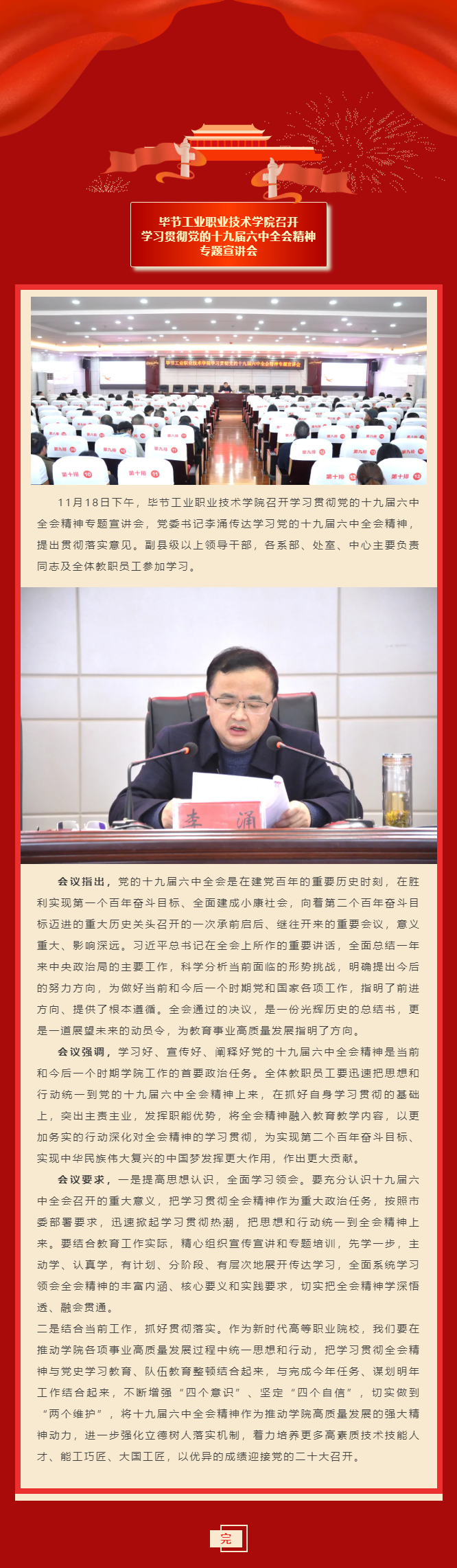 畢節(jié)工業(yè)職業(yè)技術(shù)學(xué)院召開學(xué)習貫徹黨的十九屆六中全會精神專題宣講會
