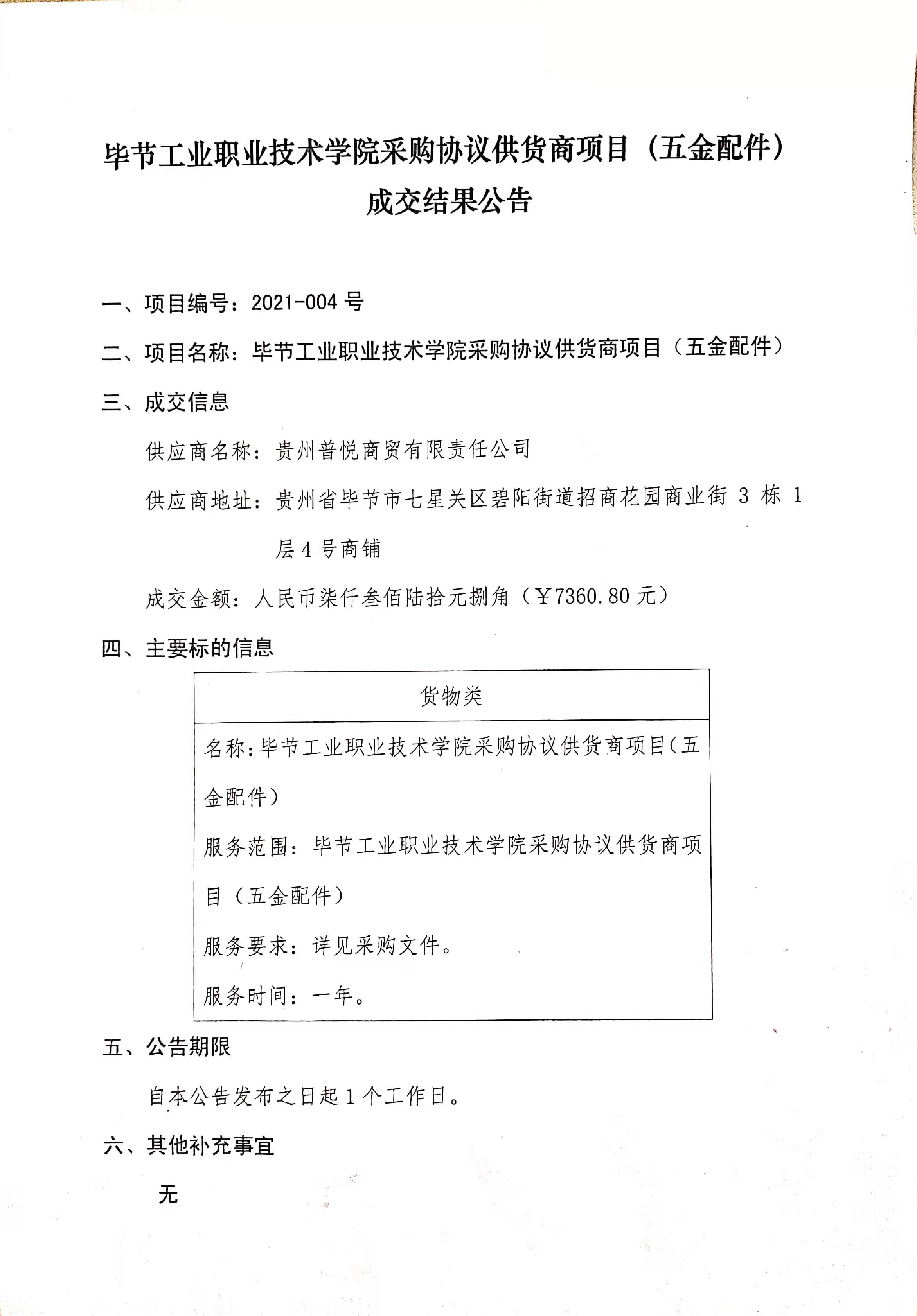畢節(jié)工業(yè)職業(yè)技術(shù)學(xué)院采購協(xié)議供貨商項目(五金配件)成交結(jié)果公告