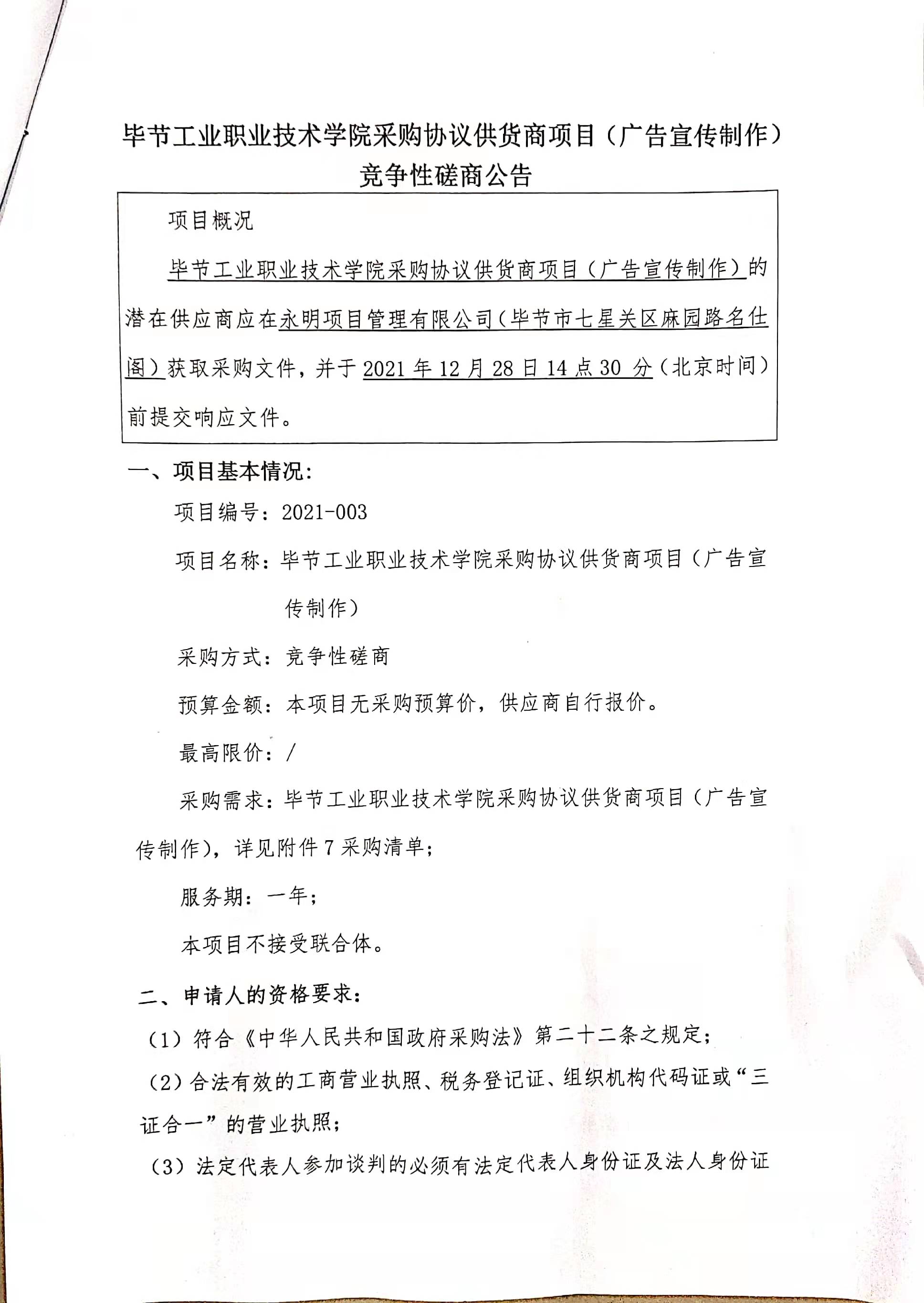 畢節(jié)工業(yè)職業(yè)技術學院采購協(xié)議供貨商項目(廣告宣傳制作) 競爭性磋商公告