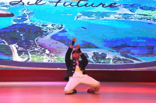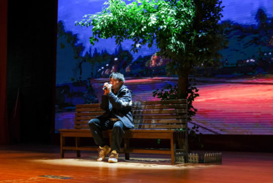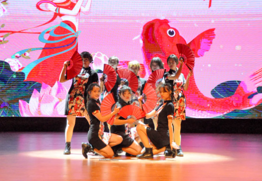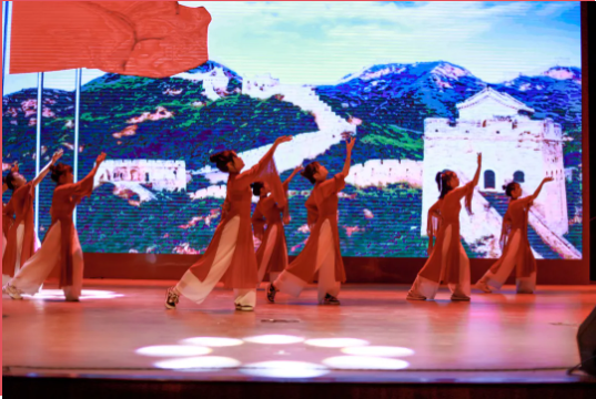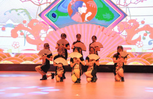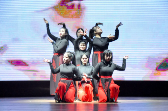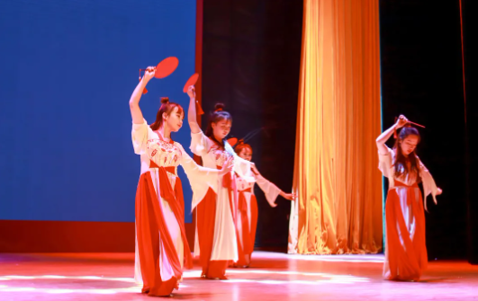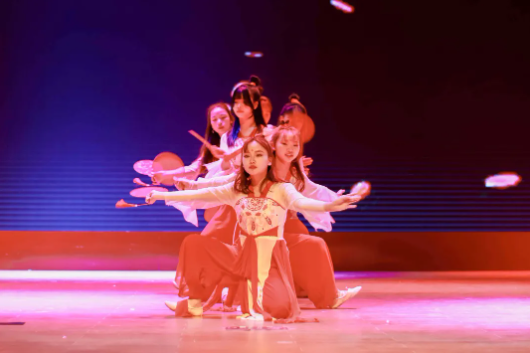 演員們舞姿靈動,神采飛揚,姿態(tài)曼妙,盡顯柔美;燈光做新衣,伴樂也陶醉,翩翩輾轉(zhuǎn),是誰的心頭泛起了漣漪。