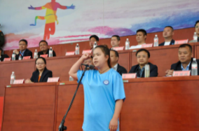 緊接著,運(yùn)動(dòng)員代表與裁判代表上臺(tái)宣誓,表達(dá)了他們對(duì)體育精神的嚴(yán)肅態(tài)度,并表示將在接下來的比賽中遵守比賽規(guī)則,力求賽出水平、賽出風(fēng)格、賽出成績(jī)。