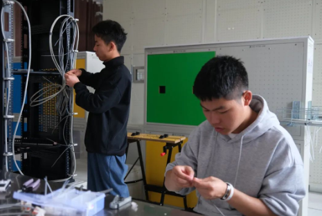 (楊建(左)宋洪宇(右)在實(shí)訓(xùn)室認(rèn)真?zhèn)滟悾?/span>