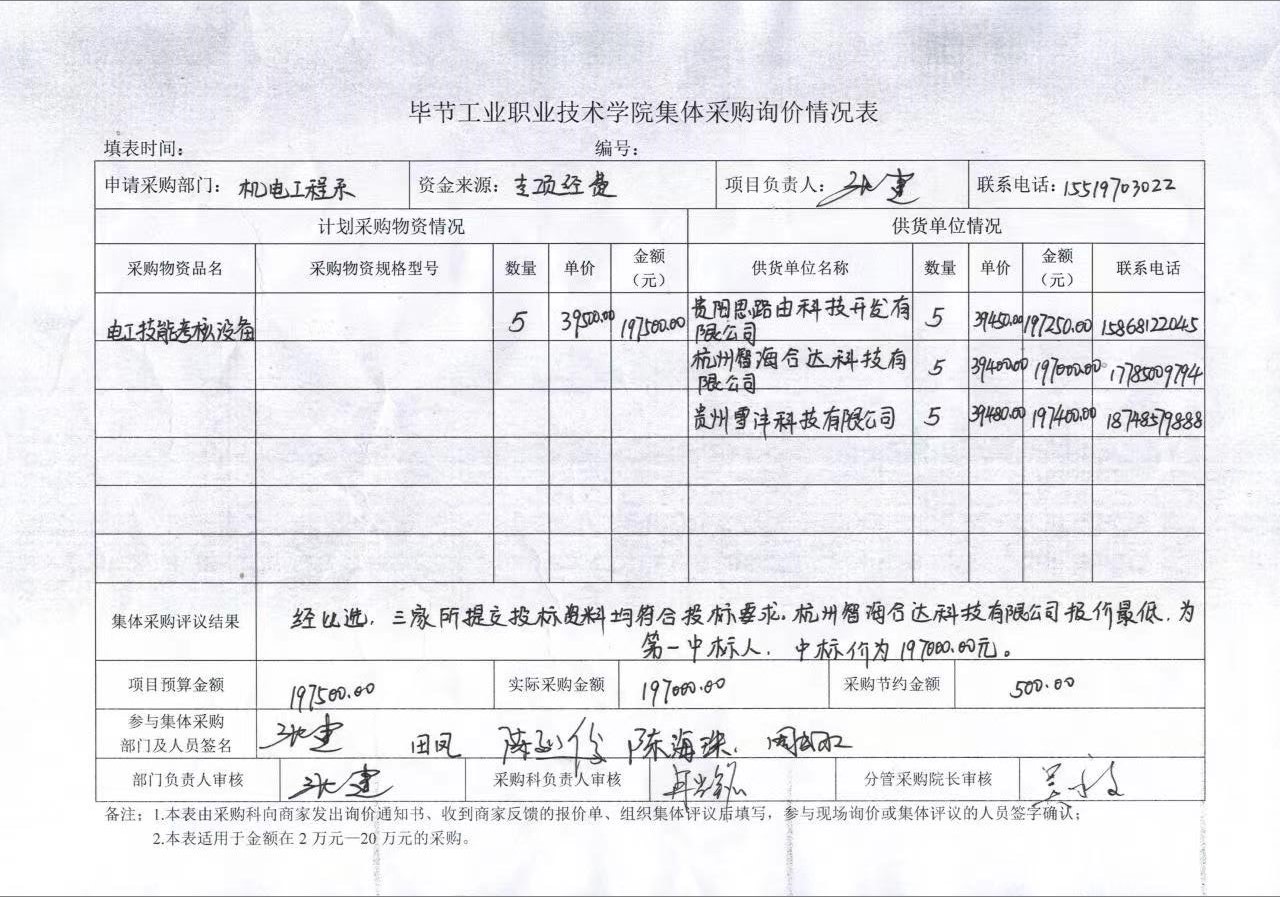 畢節(jié)工業(yè)職業(yè)技術學院電工技能考核設備集體采購詢價情況表公示