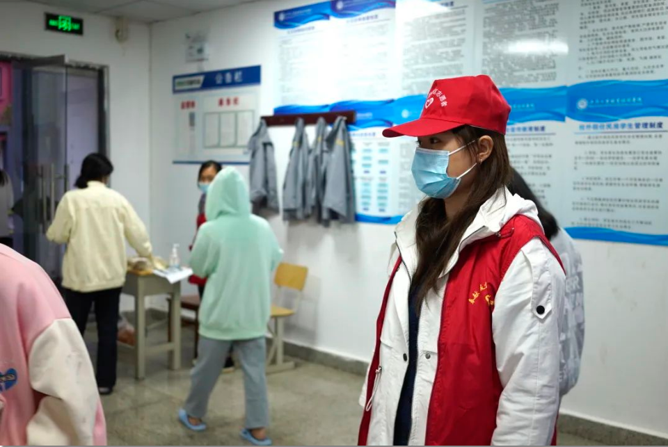 “疫”路奔跑的精靈 廖慧同學系畢節(jié)工業(yè)職業(yè)技術(shù)學院信息工程系大數(shù)據(jù)技術(shù)與應用專業(yè)學生,共青團員,志愿者。自實行靜默管理以來,廖慧主動申請加入了學院靜默管理志愿者服務隊,擔任宿舍生活區(qū)二期四號樓的志愿者小組長。 九月的畢節(jié),秋風微涼。廖慧不怕冷,不怕黑,似乎比平時堅強勇敢了許多,每天早晨,天還未亮,她就第一個起床,穿上志愿者服裝,開始準備工作。 “在這場沒有硝煙的戰(zhàn)爭中,我和老師們一起沖鋒陷陣,測量體溫、統(tǒng)計信息、匯總數(shù)據(jù)、維持秩序、通知同學。凌晨兩點,學校臨時通知全員核酸檢測,作為志愿者,凌晨一點就得起床做準備,到各個寢室敲門提醒同學,在奔跑途中,鞋子都來不及穿好,又一間一間寢室的統(tǒng)計學生在寢人數(shù),為同學們發(fā)放口罩,提醒她們多穿衣服注意保暖……”“這次參加志愿者服務,讓我收獲了很多感動,感恩老師們精心的呵護;感恩不遠千里前來支援的醫(yī)護人員;感恩每一個在冷雨中穿行的身影;感恩一日三餐為我們幫前幫后的食堂工作人員……”,廖慧同學激動地說。 “同學,注意間隔距離2米?!薄巴瑢W,請打開貴州健康碼掃描二維碼。”“同學,請有序排隊”“同學,請戴好口罩,間隔2米”。從宿舍樓到醫(yī)務室來回的奔跑,完成核酸工作已是凌晨三點多,天很冷,身體也略顯疲憊,可是廖慧同學并沒有停下,馬上又投入到核酸采樣的數(shù)據(jù)核實之中…… 廖慧同學的身后,核酸采樣工作還在繼續(xù),同學們整齊有序地矗立雨中等待,宛如一棵棵接受秋雨洗禮的青松,以昂揚的姿態(tài),迎接清晨的曙光。