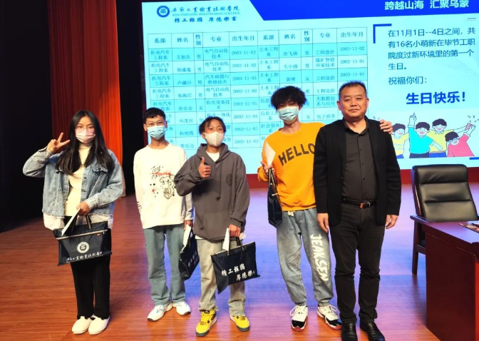 10月29日至11月1日,畢節(jié)工業(yè)職業(yè)技術(shù)學(xué)院迎來了近3000名“小可愛”。在11月2日-3日開展的“開學(xué)第一課“上,學(xué)院黨委副書記、院長邱國援為過生日的16位同學(xué)送上了一份精心準(zhǔn)備的禮物,通過別樣的祝福引導(dǎo)新同學(xué)扣好人生的“第一粒扣子”,讓他們在充滿驚喜和愉悅的氣氛下度過了進入畢節(jié)工職院的第一個特別的生日。