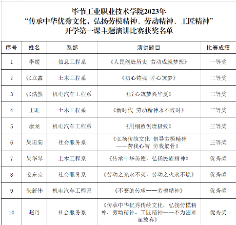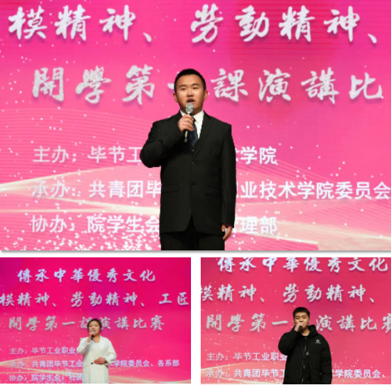 3月28日,畢節(jié)工業(yè)職業(yè)技術(shù)學(xué)院在會議中心舉辦“傳承中華優(yōu)秀傳統(tǒng)文化,弘揚(yáng)勞模精神、勞動精神、工匠精神開學(xué)第一課”主題演講比賽?;顒又荚趯W(xué)習(xí)貫徹黨的二十大精神、習(xí)近平總書記在全國高校思想政治工作會議上的講話精神,傳承中華優(yōu)秀傳統(tǒng)文化,弘揚(yáng)勞模精神、勞動精神、工匠精神,踐行社會主義核心價值觀。