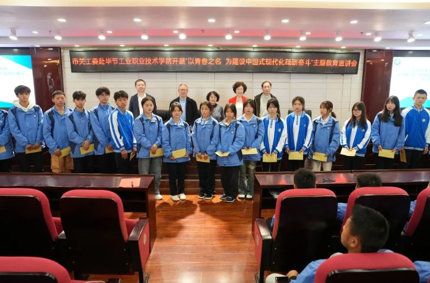 4月28日,畢節(jié)市關(guān)工委主任周長琦、副主任杜娟、謝正發(fā)、潘軍偉一行赴我院開展主題教育宣講并實(shí)地調(diào)研我院辦學(xué)情況。學(xué)院黨委委員、副院長吳家文,黨委委員、組織部長申開谷,工會(huì)、婦聯(lián)主席李淑文及相關(guān)部門人員陪同調(diào)研。宣講會(huì)由吳家文主持,學(xué)院師生代表200余人聆聽宣講。