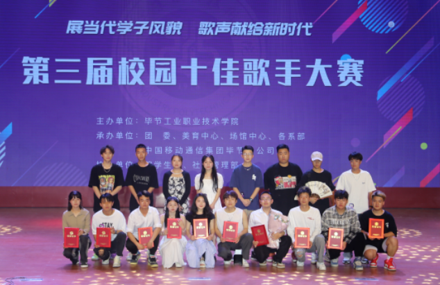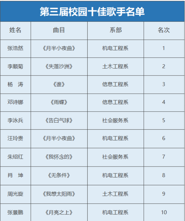 (活動(dòng)現(xiàn)場(chǎng)) 音符在旋律中跳動(dòng) 歌聲在校園里蔓延 青春的汗水在舞臺(tái)上揮灑 夢(mèng)想的聲音在賽場(chǎng)上飄蕩 這是一個(gè)用青春與夢(mèng)想搭建的舞臺(tái) 這是一個(gè)充滿激情與才華的音樂盛會(huì) (十佳歌手展示) 此次十佳歌手大賽 展示了我院學(xué)生的青春風(fēng)采 豐富了學(xué)子們的課余生活 更營(yíng)造出了積極向上的校園氛圍 (活動(dòng)現(xiàn)場(chǎng)) 經(jīng)過在場(chǎng)評(píng)委的公正評(píng)選 第三屆十佳歌手已然誕生 讓我們恭喜這些在此次大賽中 脫穎而出的工職院青年們 他們用自己的青春熱血 詮釋了學(xué)院充滿活力的一幕
