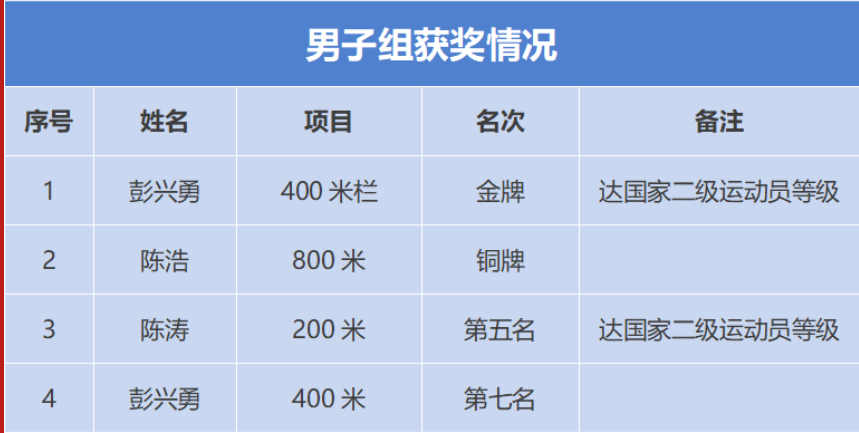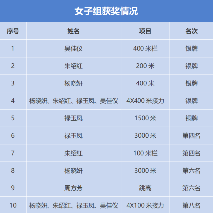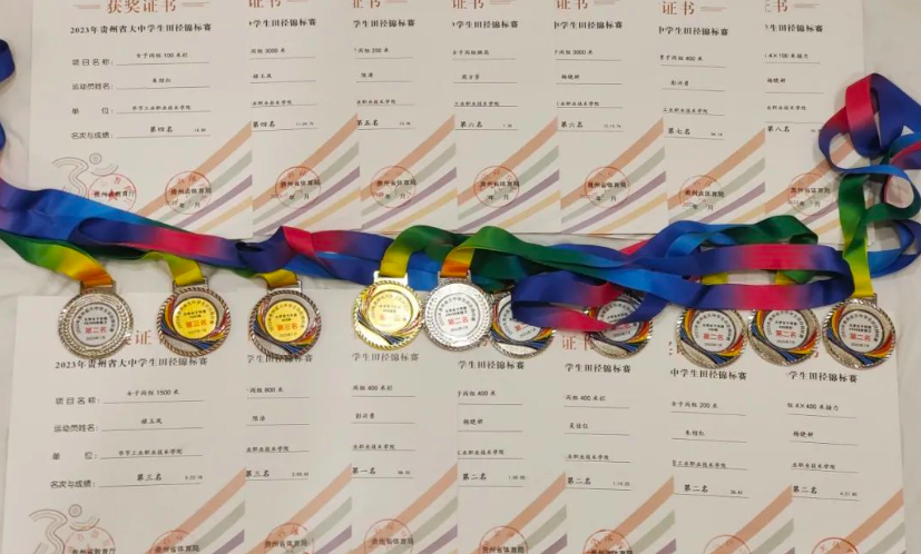 在2023年貴州省大中學(xué)生田徑錦標(biāo)賽中,我院田徑隊在冉光銘、成熊、衛(wèi)平三位教練員的帶領(lǐng)下頑強(qiáng)拼搏、團(tuán)結(jié)奮戰(zhàn),圓滿完成了各項賽事,共獲得獎牌10枚,其中金牌1枚、銀牌7枚、銅牌2枚,7人次獲得4-8名,2人達(dá)國家二級運(yùn)動員等級,榮獲團(tuán)體總分第五名。