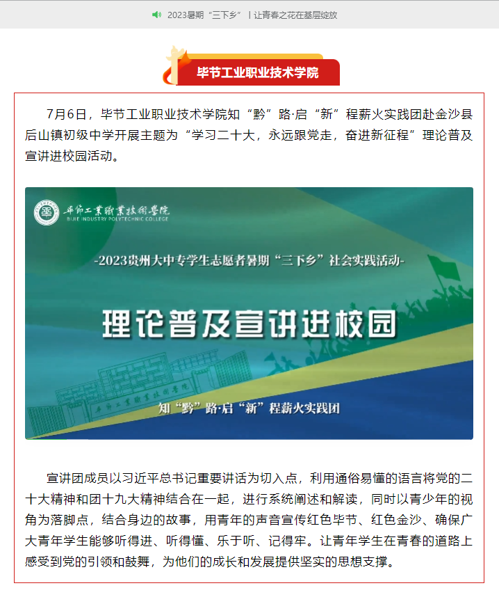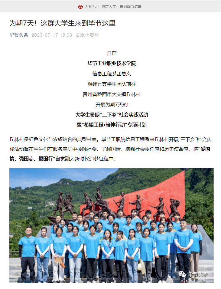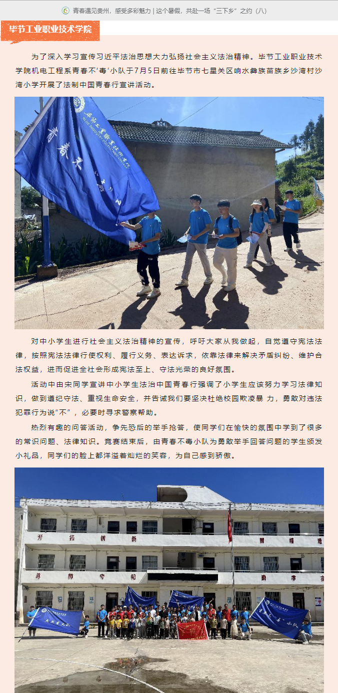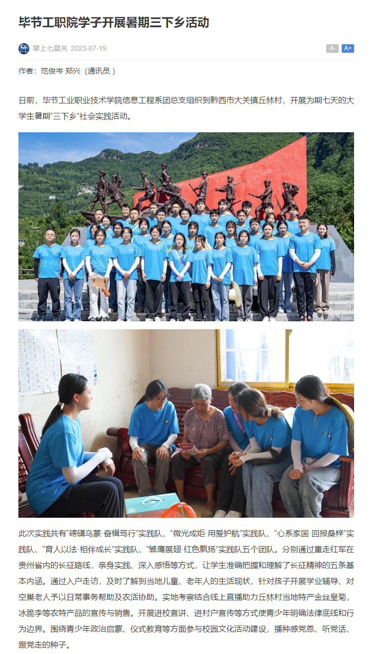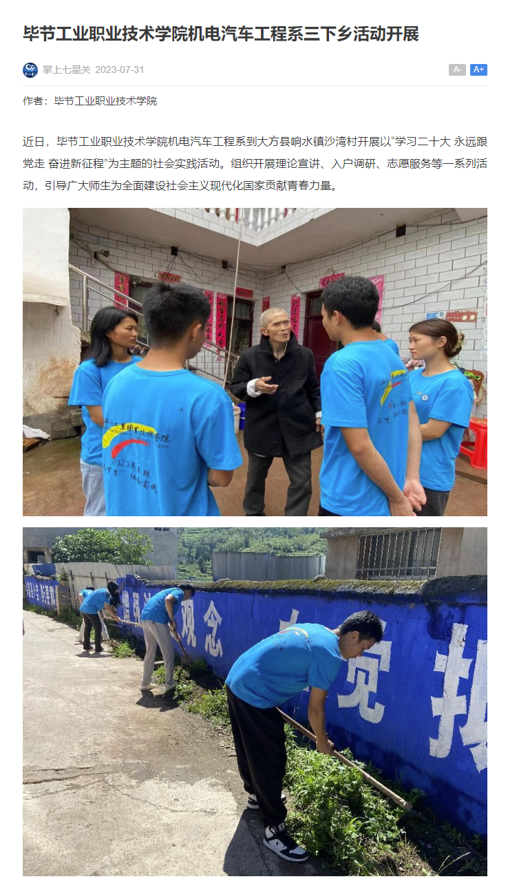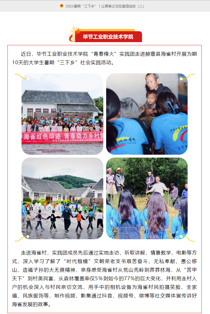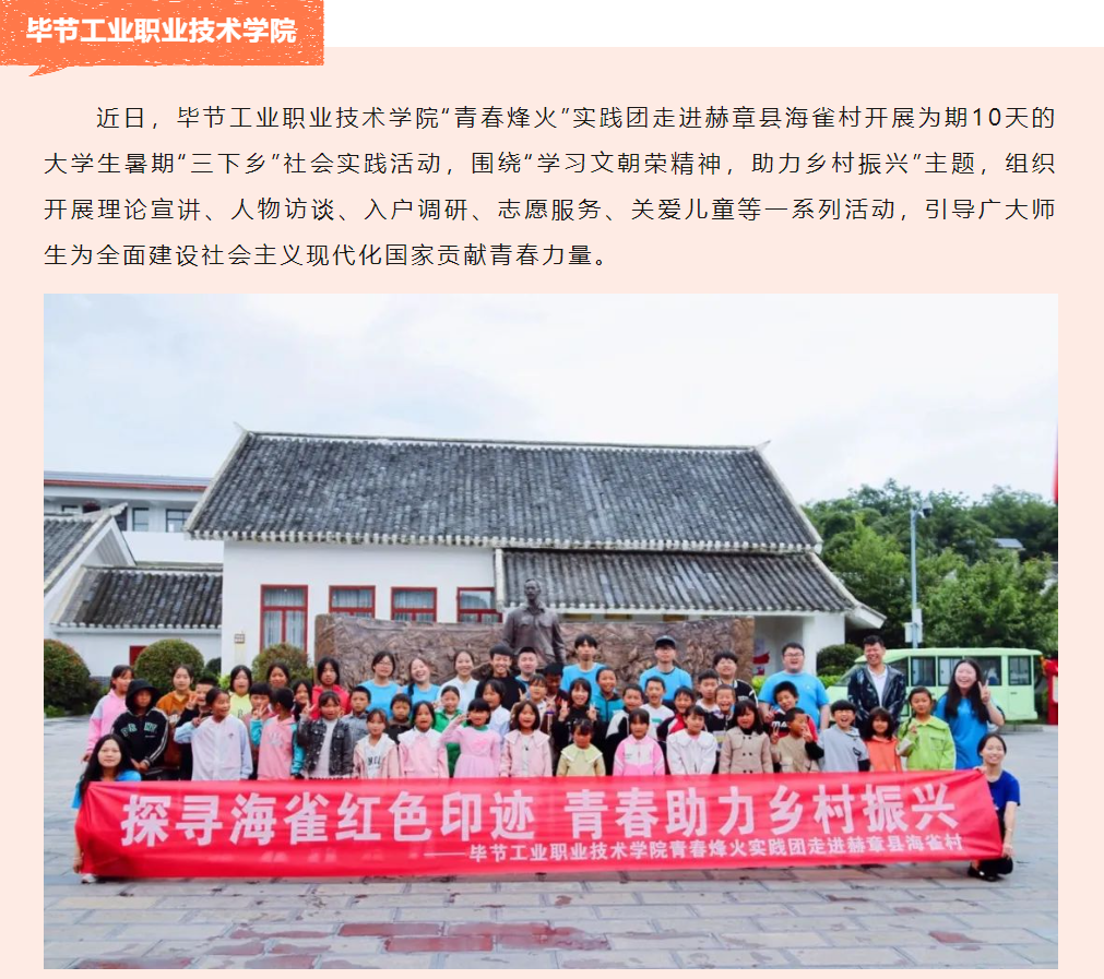 在我院今年暑期“三下鄉(xiāng)”社會實踐活動中,22支實踐隊走進基層、社區(qū)、農(nóng)村,精心開展主題鮮明、形式多樣、有內(nèi)涵、有質量的實踐活動,足跡遍布黔東南州榕江縣兩汪鄉(xiāng)、畢節(jié)市赫章縣海雀村、黔西市大關鎮(zhèn)丘林村、金沙縣后山鎮(zhèn),七星關區(qū)陰底鄉(xiāng)羅雄村、先鋒村等地,選題覆蓋了黨史學習教育、鄉(xiāng)村振興、優(yōu)秀傳統(tǒng)文化傳承、理論宣講、教育關愛、成就觀察等多個方面。自暑期“三下鄉(xiāng)”社會實踐活動啟動以來,受到多家主流媒體的廣泛關注和報道,社會實踐工作的影響力顯著增強。