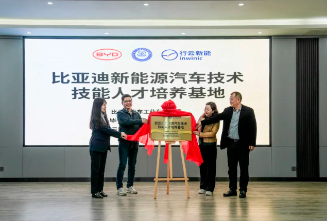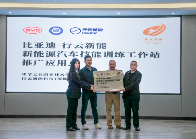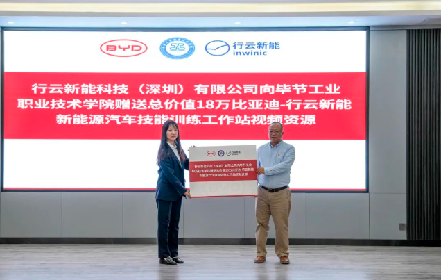 (會議現場) 會上,邱國援介紹了畢節(jié)工業(yè)職業(yè)技術學院發(fā)展現狀、辦學特色、辦學理念等情況,并指出希望通過發(fā)揮企業(yè)的市場、技術、設備等方面優(yōu)勢,共建人才培養(yǎng)基地,為學院相關專業(yè)學生提供優(yōu)質技能學習條件,進一步推動校企合作,深化產教融合,實施人才精準培養(yǎng)、企業(yè)精準招聘,促進人才鏈與產業(yè)鏈無縫銜接,探索校企合作辦學模式與運行機制,創(chuàng)新技術技能人才培養(yǎng)體系,豐富職業(yè)教育內涵建設,進一步發(fā)揮職業(yè)教育優(yōu)勢服務社會、行業(yè)、企業(yè)。 蔣平指出,希望與畢節(jié)工業(yè)職業(yè)技術學院在“產、學、訓”等方面密切合作,創(chuàng)新人才培養(yǎng)模式,共同培養(yǎng)更多高素質、高技能的應用型人才,促進共同發(fā)展。 王克靜指出,將在下一步的合作中提供全產業(yè)鏈人才培養(yǎng)生態(tài)系統服務整體解決方案,與學院、比亞迪共同開發(fā)課程與教材,優(yōu)化課程體系,搭建“產、學、研”服務平臺,推動人才培養(yǎng)模式改革、管理體制機制創(chuàng)新,助力培養(yǎng)企業(yè)所需的高素質技能人才。 (簽約儀式) 基地投入使用后,校企雙方將共同制定人才培養(yǎng)方案,通過企業(yè)工程師入校教學、教師定崗實習培訓,實現教師技術技能和教學能力雙提升,利用行業(yè)標準和企業(yè)、社會資源提高專業(yè)建設標準,打造高質量行業(yè)人才培養(yǎng)體系,切實提升我院人才培養(yǎng)質量和水平。 (揭牌儀式) (授牌儀式) 會上,畢節(jié)工業(yè)職業(yè)技術學院還與比亞迪汽車股份有限公司、行云新能科技(深圳)有限公司舉行了簽約、揭牌、授牌儀式及新能源技術技能工作站捐贈儀式。 (捐贈儀式)