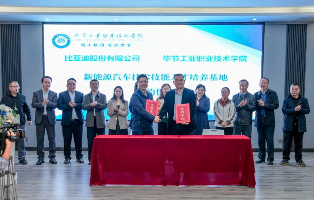 11月10日,畢節(jié)工業(yè)職業(yè)技術學院與比亞迪汽車股份有限公司、行云新能科技(深圳)有限公司開展“比亞迪新能源汽車技術技能人才培養(yǎng)基地”簽約儀式。學院黨委副書記、院長邱國援,畢節(jié)市教育局黨組成員、副局長金莉,比亞迪西南地區(qū)人力資源總監(jiān)蔣平,行云新能科技(深圳)有限公司副總經理王克靜出席儀式。學院、比亞迪、行云新能相關領導及學院汽車工程系師生代表參加儀式。儀式由學院黨委委員、副院長吳家文主持。