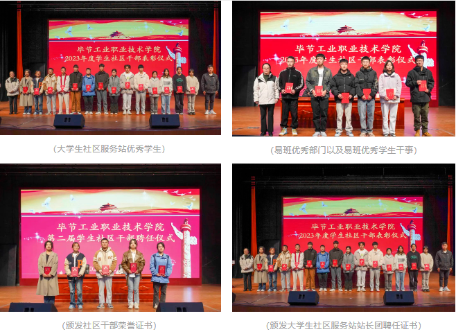 12月6日,畢節(jié)工業(yè)職業(yè)技術學院“一站式”學生社區(qū)干部表彰及聘任儀式在多功能廳召開。學院黨委委員、副院長黃文碧出席儀式并為受表彰和聘任的同學頒獎,學生工作處負責人胡永祚主持會議并為大學生社區(qū)服務站優(yōu)秀學生頒發(fā)榮譽證書。學院相關部門主要負責人,社區(qū)管理委員會、易班工作及系部師生代表800余人參加儀式。