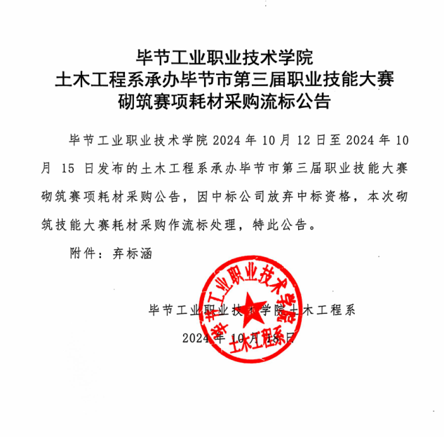 畢節(jié)工業(yè)職業(yè)技術(shù)學(xué)院土木工程系承辦畢節(jié)市第三屆職業(yè)技能大賽砌筑賽項(xiàng)耗材采購(gòu)流標(biāo)公告