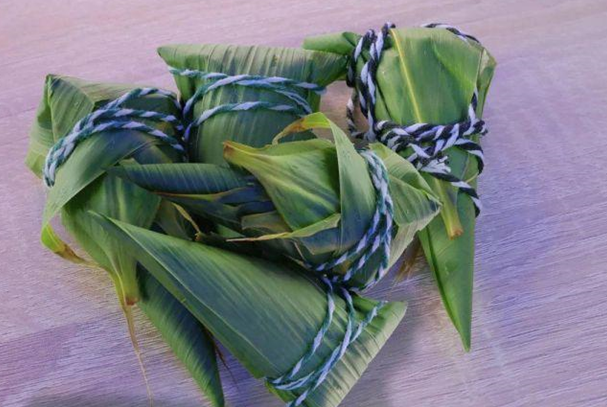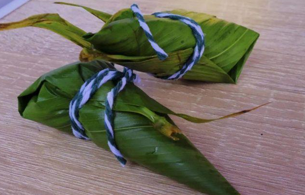 看著同學(xué)們嫻熟的手法,捻起一片粽葉,三兩下卷成漏斗狀,再舀起一勺米和紅棗倒入粽葉中,隨后用粽葉把糯米包裹緊實(shí),系上繩子,一顆顆肥碩的粽子就這樣完成了。